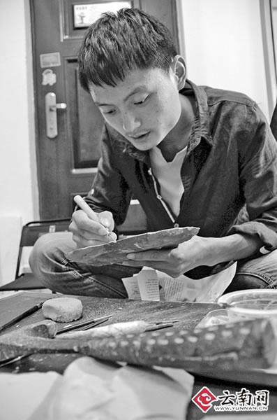 目前正在自学珠宝设计的他,在这方面也有了一些实践,现在有人会拿着石头去找他,请他做一些化石的手工艺品,他就在这些石板上按照“客户”的要求雕刻化石模型。“我对寒武纪生物的结构很清楚,雕刻得还是很不错的。”
