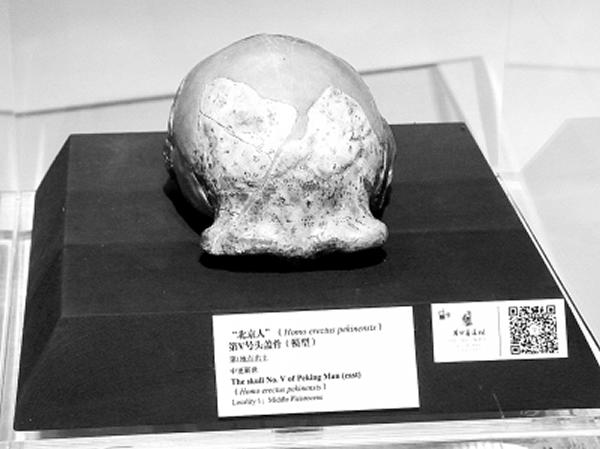 博物馆新馆内展出的北京人头盖骨化石模型
