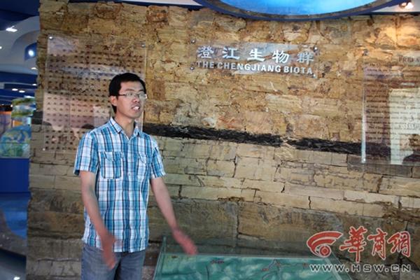 云南省古生物研究重点实验室研究人员丛培允给记者们介绍澄江生物群