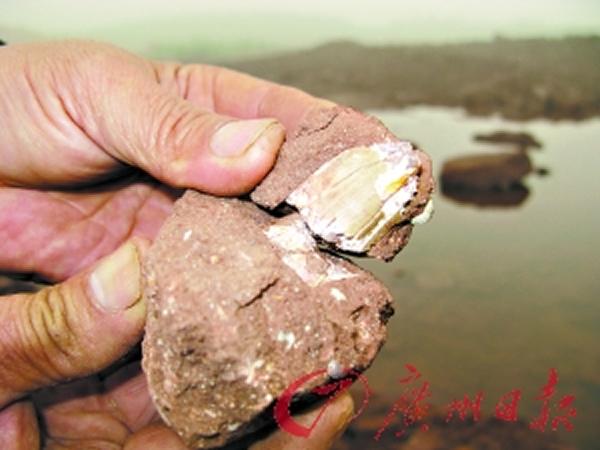 很快,一个年轻的小伙子指着石块告诉大家:“我找到恐龙骨化石了。”化石从外表上并没有什么特别,白色的物质“镶嵌”在红色的岩石里,骨头上还有淡黄色的纹路。这块长约20厘米的骨头,就是珠三角发现的第一块恐龙骨化石。