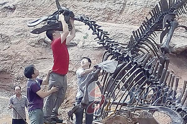 (化石网报道)据水母网(通讯员 董新云 YMG记者 高伟 摄影报道):1951年,新中国第一具完整恐龙骨架化石———棘鼻青岛龙化石在莱阳市吕格庄镇金岗口村出土,成为中科院古脊椎动物与古人类研究所的“镇馆之宝”。8月3日,两具与“第一恐龙”同比例复制的恐龙模型在发掘原址组装完成,棘鼻青岛龙在历经了63年的研究探索之后,终于“重返故里”。