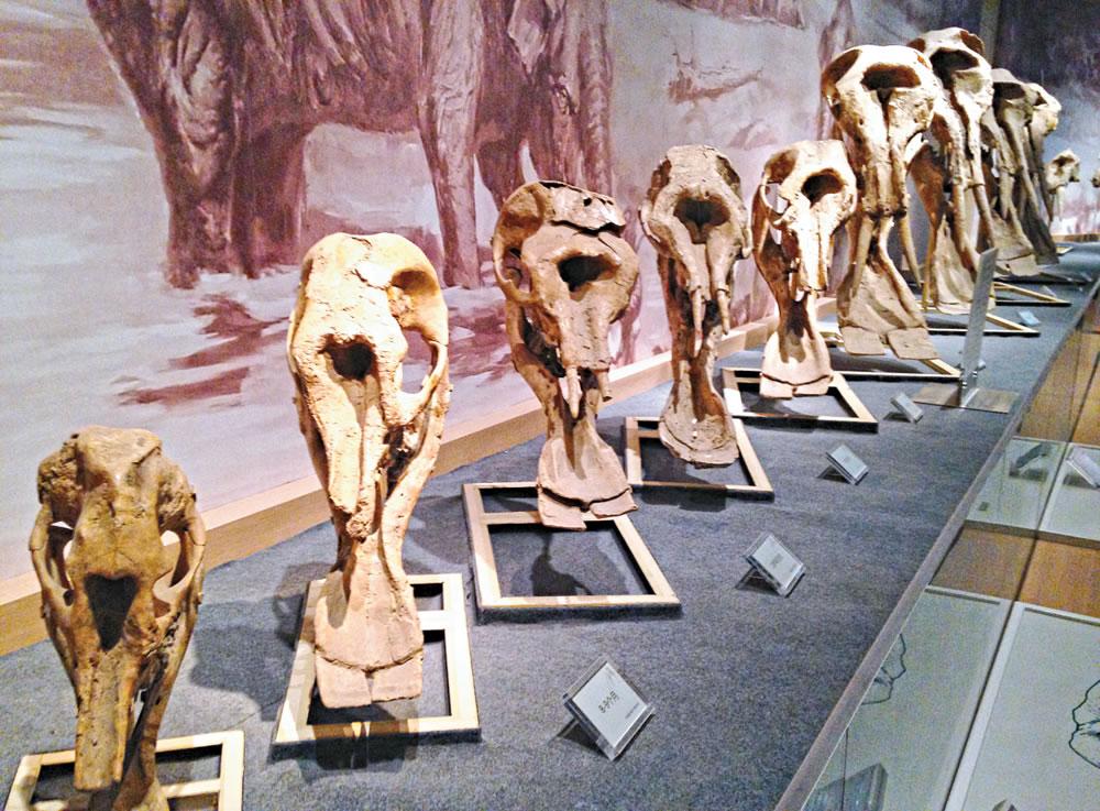 博物馆藏品种类之丰富,数量之繁多,保存之完好都会让人深深惊嘆。该博物馆引以为豪的六项世界之最分别为:世界上最丰富的铲齿象化石;世界上最大的三趾马化石产地;世界上独一无二的和政羊化石;世界上最大的巨鬣狗化石;世界上最大的真马埃氏马化石以及世界上最早的披毛犀化石。其中最令人影响深刻的是唯一现存的一套铲齿象头骨发育系列。这一套九件的化石依次排开,最小的化石是一岁多幼年铲齿象的头骨,而最大的则是40多岁老年铲齿象的头骨,其体积是幼年铲齿象头骨的20多倍。如此丰富而完整的馆藏不禁让人嘆为观止。此外,整个展馆的高度专业化也给人留下深刻印象。每一件大型动物化石都会用隔离挡板做保护,化石后面都配有大型图片还原古动物的样子,而所有的图片都是按照与化石1:1的比例还原的,让参观者能够更好地了解古动物。