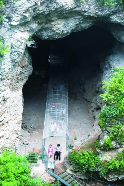 游客在猿人洞鸽子堂洞口参观。鸽子堂是周口店北京人遗址中猿人洞的一部分。