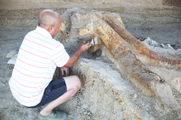 在发掘现场,笔者看到象头化石微微向上仰起,一根象牙化石较完整,长度约1.5米;另一根象牙化石前方有残缺,长度约1.2米,象的臼齿化石清晰可见。