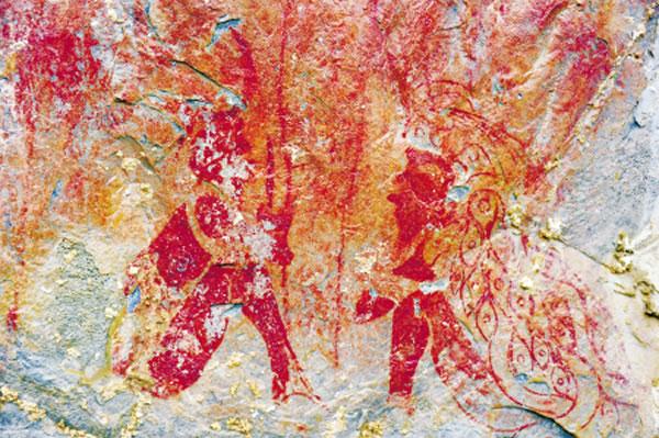 贞丰大红岩史前岩画表达出来的信息,也大抵如此。环顾大红岩周边环境,你会觉得对远古人类来说,这里还真是一个不错的地方。比如说,岩壁下方敞露着3个岩洞,正好可供他们遮风蔽雨,世代居住;背靠高岩、面临深沟的环境,也正好可以防止野兽的袭扰;沟底的小河有鱼虾,树林中有野果和多种动物,可终年为他们提供食物。每当狩猎归来或闲暇之时,他们心情舒畅,从而饶有兴致地把猪、牛、鹿、蛇、孔雀等动物图案绘制于岩壁上。而男女相依对视的画面,也正好说明即使在远古人类的男女之间,也不时涌动着微妙的爱的暖流……