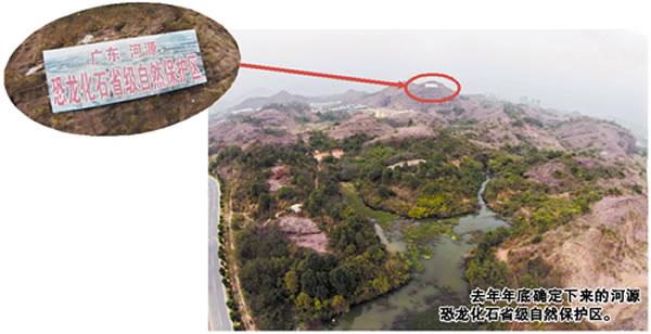 据了解,2001,河源恐龙化石省级自然保护区经省政府批准确立,为源城区源南镇胜利村现河源大学城一带。2003年起,河源市政府将保护区调整到保护价值更大的源城区源南镇风光村石峡一带,总面积为1.3平方公里,四至边界依次为:北至双下路北侧道路边线,东至风光村三王坝村民建房用地和自然山体,南至山泉路延伸线北侧道路边线,西至河源大道东已出让办证土地以东的4米红线处。去年年底终获省政府批准。
