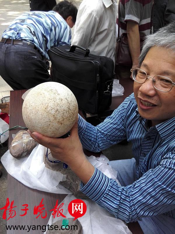 同样是来自山东的马先生,他带来了一个神秘的“蛋”,在现场引发了鉴定专家们的“大争论”。“这个‘蛋’是在我们那里的青云山挖的的。”马先生告诉记者,他是开挖掘机的,在青云山作业的时候,无意中挖到了它。“还是一年前的事,正好要来南京玩,就顺便把它带来鉴定。我记得它埋藏的深度不超过15米。周围的朋友有的说是鸵鸟蛋,有的说是恐龙蛋,我就想知道它到底是什么。”