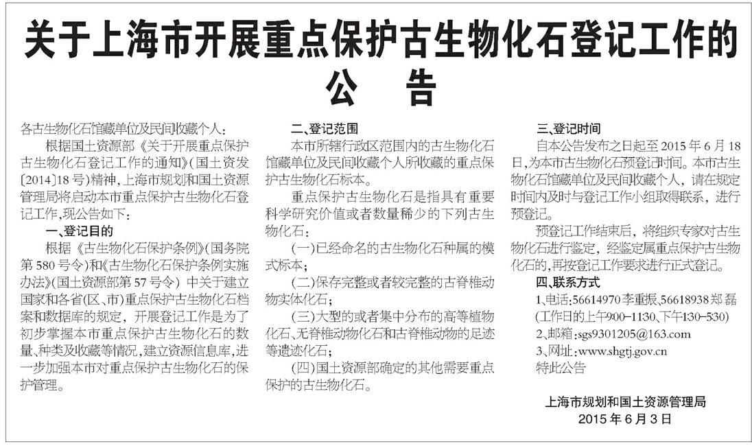 关于上海市开展重点保护古生物化石登记工作的公告