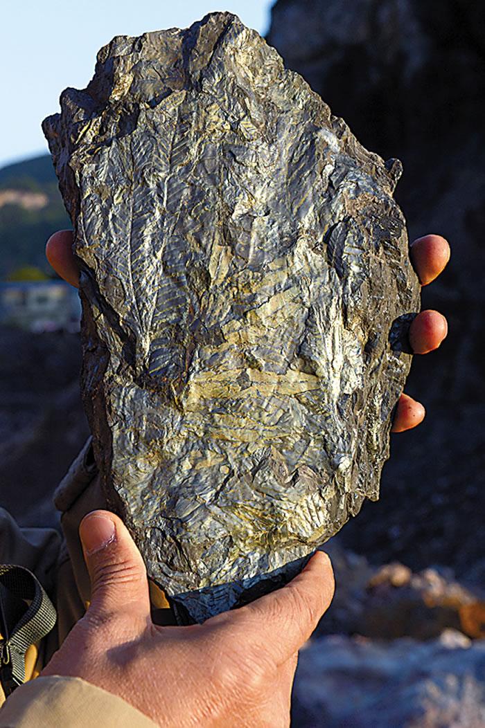 段维带着记者踩着瓦砾一路往前走,随手捡起一块煤块状岩石:“这就是植物化石。”记者仔细观察,这些煤块确实与普通石头不一样,煤块上不少规则的白色痕迹,以中间为界,两边的椭圆形痕迹规则地一字排开,看上去颇似一种树叶,“这是蕨类植物化石。”段维说。