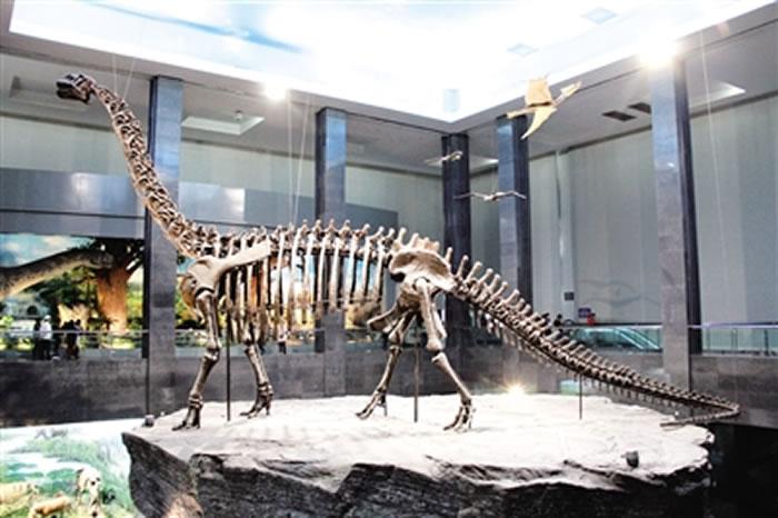内蒙古博物院收藏的亚洲最大的白垩纪恐龙——查干诺尔龙骨骼化石。
