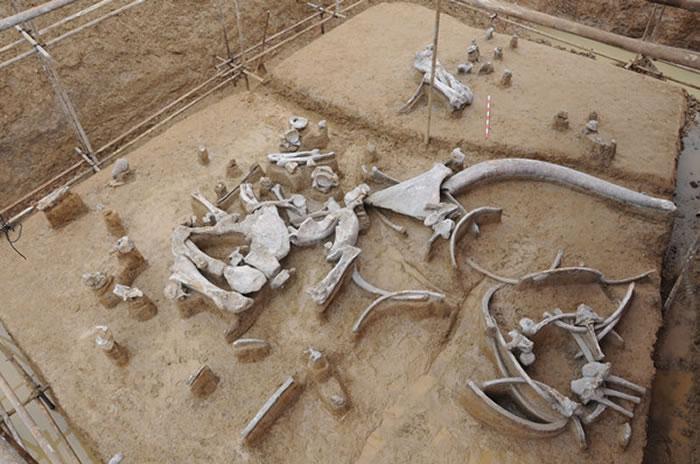由中科院古脊椎动物与古人类研究所、宿迁市博物馆、泗洪县博物馆组成联合考古队对该遗址进行抢救性考古发掘。经过一个多月的考古发掘,现场发现左侧象牙、下颌骨、盆骨、脊椎骨、肩胛骨、股骨、肱骨、肋骨等化石100余块,象牙粗约20厘米,长约3米。根据臼齿磨痕等现象,考古人员初步推断该化石为淮河古菱齿象化石,距今约五万年,象龄约50岁,身高约4米。考古人员对现场进行拍照、录像、画图,完整收集科学资料,用颗粒胶对化石加固,用石膏打包化石分块提取保存。