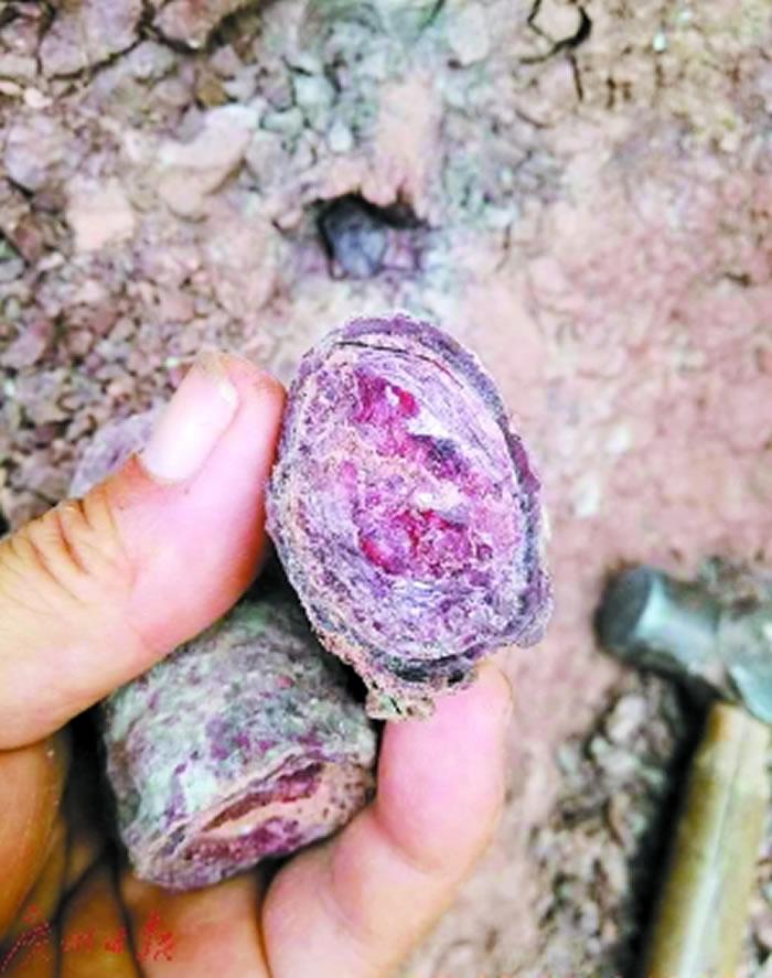 为什么该牙齿化石会呈现紫红色?对此,张显球解释,现在看到的不一定是它原来的颜色,该牙齿化石浸染了泥土中的矿物质,埋在地里数千万年,颜色会发生变化。
