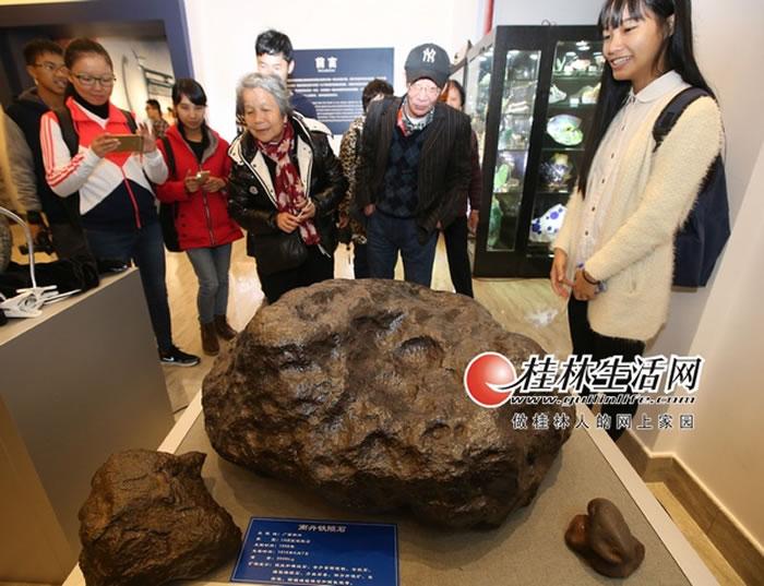 参观者被“镇馆之宝”——一块来自太空,重达3.5吨的南丹铁陨石吸引。