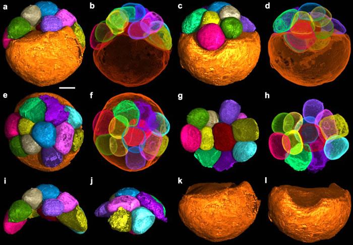 由中国科学院南京地质古生物研究所殷宗军副研究员率领的研究团队在《地质学》(Geology)上报道了最早的具盘状卵裂形式的动物胚胎化石,为了解早期动物发育模式以及动物直接发育模式的起源带来新的启示。该成果利用同步辐射断层成像技术在瓮安生物群中发现一类具有典型盘状卵裂特征的标本。纵观生命之树,只有两侧对称动物(比如鹦鹉螺、蝎子、斑马鱼等)的胚胎具盘状分裂模式。该发现表明两侧对称动物特有的某些发育机制在6亿年前就已经起源。