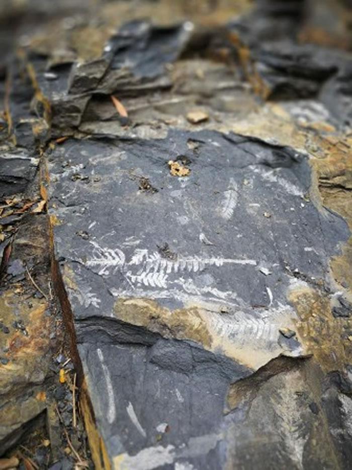 沿着山径攀上山腰,一片片带有古植物化石图案的火山岩展现眼前。古化石的表面有旧有新。旧的颜色暗淡,图案模糊;新的黑白分明,图案清晰。段维指着一片图案清晰的石面告诉记者,原来附在其表面的岩层已经被盗采,仔细查看在岩石边缘可以找到凿撬留下的痕迹。记者现场观察,有三四处古化石表面图案清晰,周边可以看到盗采后留下的新石块。