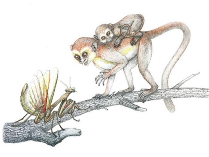 复原图中,体型稍大的一只曙猿拖着长长的尾巴,背着一只幼猿爬在树干上,瞪大双眼,露出尖锐的牙齿,正在用手捕食一只螳螂。有趣的是,与比例上看,成年曙猿体型仅比螳螂略大一些。