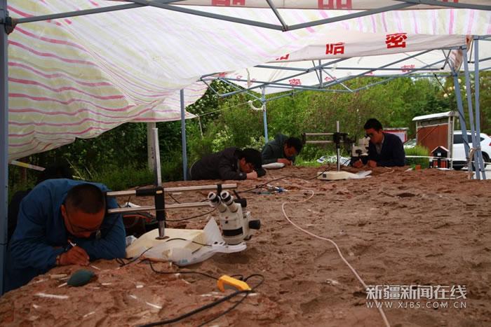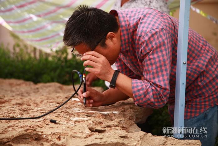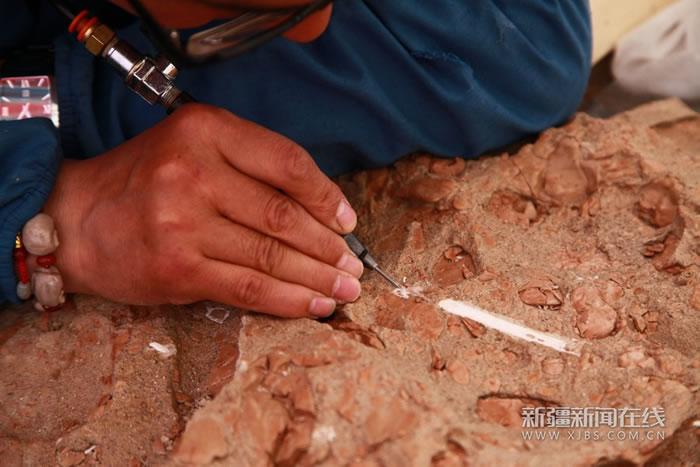 (化石网报道)据新疆新闻在线网(哈密台记者 王昊鹏):4月26日上午,记者在哈密市博物馆前广场上看到,来自中国科学院古脊椎动物与古人类研究所的专家和技术人员,正在对一块巨大的翼龙化石标本进行修理。