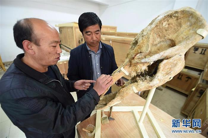 4月28日,在甘肃和政古动物化石博物馆修复室,修复技术人员陈善勤(左)、鄂春祥在修复古动物化石。