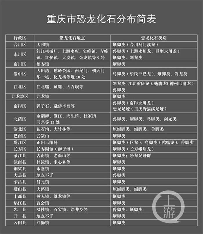 重庆恐龙化石分布简表