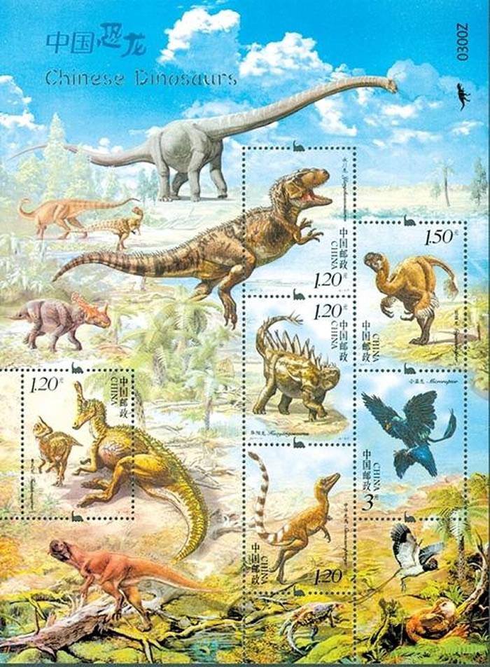 中国的恐龙化石埋藏丰富,常被称为“恐龙第一大国”。经考证,截至2014年5月,中国已经命名的恐龙属种有244种,位居世界第一。据悉,将于本月19日首发的《中国恐龙》特种邮票前期已经过专家多次论证,共选定青岛龙、永川龙、华阳龙、中华龙鸟、巨盗龙、小盗龙以及用于小型张图案的马门溪龙等7种恐龙作为主图邮票。这7种恐龙表现的是最能够反映恐龙与鸟演化关系的代表性品种,剩余的恐龙种类则多通过边饰呈现。
