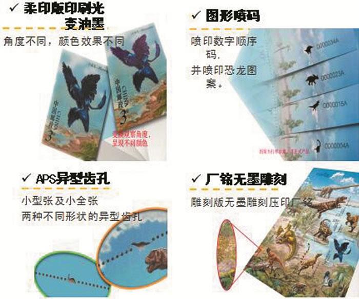 以特殊胶印油墨为例,本套特种邮票在印制环节加强了对无色荧光技术的运用,可以立体地呈现出恐龙化石骨骼和生物形态的复原图,进而提升了这套邮票的趣味性和科普性。在荧光灯下,可以清晰地看到每一条恐龙的骨骼构架,有利于恐龙爱好者及青少年等加深对恐龙形态和结构的了解和认识。特种光变油墨的采用也同样产生不同的视觉效果,以 (6-6)T小盗龙为例,可以从不同的角度看到其天然的毛色光变效果。此外,还利用雕刻版无墨雕刻压印厂铭,使本套邮票触感十足,如果将手放在厂铭处,可以明显感觉它的凹凸感。为了保护集邮者权益,《中国恐龙》邮票还采用了防伪纸张、防伪油墨等防伪手段。