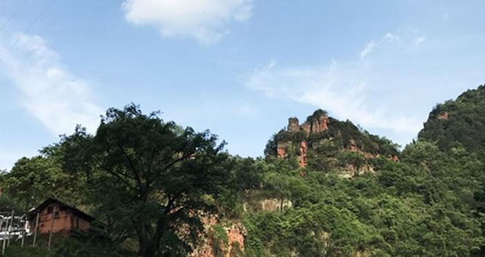 疑似恐龙的脚印,位于大山深处的同民镇蔺江村的同民河边。这些大小不一、方向不一的印痕,嵌入河边红色石板,每个印痕都酷似鸡爪印,有三个 “ 脚趾 ”。