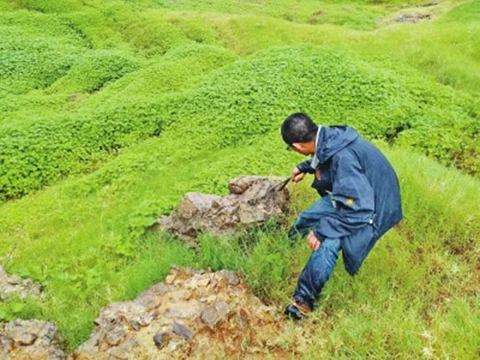 专家对上河曙猿遗址的现状进行调查时,在野草丛中发现了成片的化石裸露区。