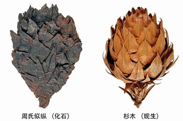 经过对比,他与同事们发现周氏似纵的球果,雄球花和营养枝叶直接相连,形态上与现生柏科的杉木非常类似。比如球果,1.1亿年前的周氏似纵和现在的杉木几乎没有区别;而叶片形态和现在的杉木也很相似,只是叶片上的气孔更密集,可能和当时二氧化碳浓度较高有关。“所以我们将这些化石归为柏科,它们是现生杉木的祖先。”