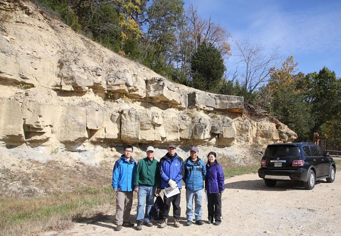 会后,10月26-11月6日,王向东等五人前往美国密西西比河谷地区开展野外地质工作,对经典的北美石炭系密西西比亚系地层进行地层古生物调查。国际著名的石炭纪有孔虫化石专家Paul Brenckle博士陪同并作详细介绍。在密苏里州、爱荷华州和伊利诺伊州依次考察了密西西比亚系Kinderhookian统、Osagean统、Meramecian统和Chesterian统的27个剖面,其中多个剖面为北美区域岩石地层单位的命名剖面。通过实地的野外地质工作,了解了北美中部地区密西西比亚系的地层出露情况、各个岩石地层单位的岩性和化石组成、以及该时期该地区的古生态与古环境,为后续开展全球地层对比及金钉子研究奠定基础。