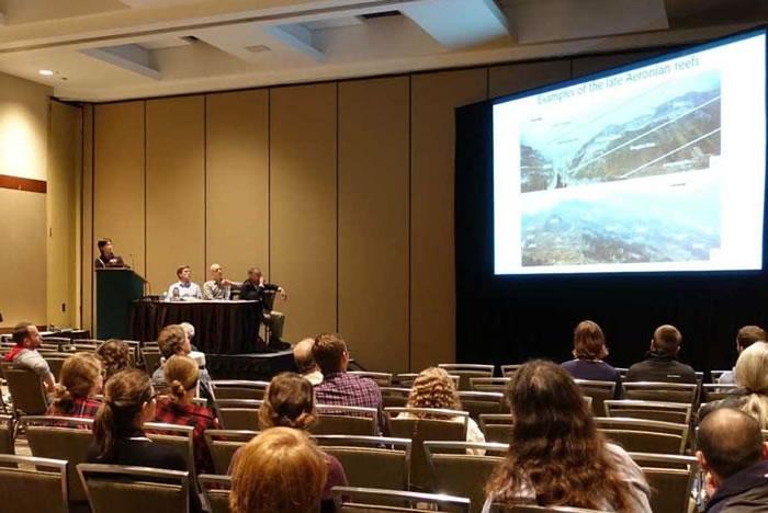 在年会上,南京古生物所参会的人员以口头报告和墙报的形式介绍了各自最新研究成果,包括古生态、古植物、生物礁、珊瑚、有孔虫、沉积岩石学、地球化学、古昆虫学等的研究内容,参加了北美古生物协会、有孔虫协会、以及国际地学计划IGCP653项目等同行的研讨会。在会议期间,参会人员积极与各国学者开展学术交流和讨论,与相关国际同行就感兴趣的研究方向进行商议,并就将来的国际合作进行了意向性的讨论。