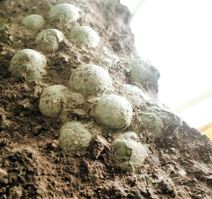 凭借经验,经过近一个小时的摸索,在距离海岸线五百米的一个山头上,黄志青判定一个砂质较细的红砂岩断崖里面,有可能会有“料”。考古队在项目工程挖掘机和爆破人员的把帮助下,用炸药炸开了断崖一处。让黄志青等人大喜,一窝完完整整的恐龙蛋化石出土了。“真是宝物,这是一窝14枚非常完整硕大的恐龙蛋化石,河源地区此前出土了17000枚恐龙化石,但从来没有一窝这么完整漂亮的。”黄志青回忆当时的情形仍然兴奋不已。