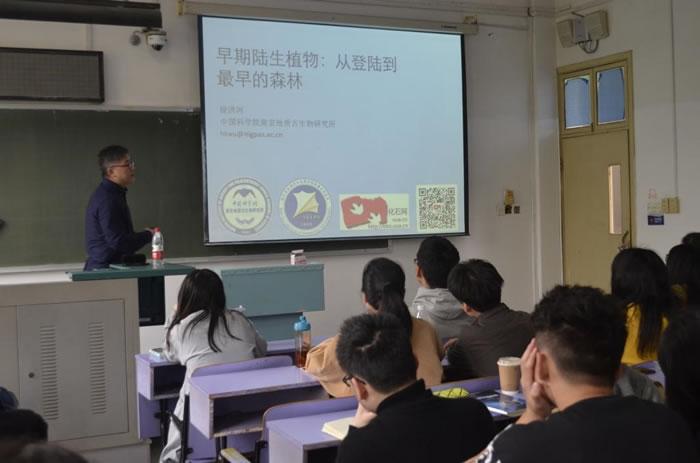 (化石网报道)据中国科学院南京地质古生物研究所:4月16日上午,在中国地质大学(武汉)李四光学院2018年地球科学前沿课上,中国科学院南京地质古生物研究所徐洪河研究员为菁英班学生做了“早期陆生植物:从登陆到最早的森林”主题讲座。