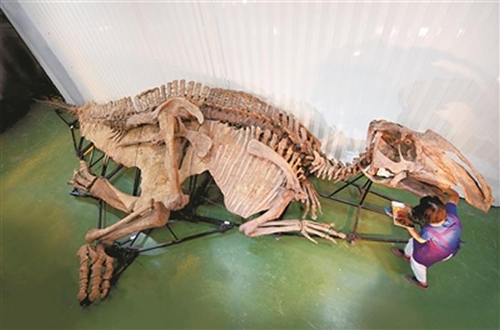 “美国自然博物馆分析,这条恐龙当时死的时候,是在一个原始森林的沼泽地里,沼泽里有很多硫化物,它倒下去的时候,被硫化物覆盖了,跟空气形成隔绝,就成了木乃伊。”郴州国际矿物宝石博览有限公司总经理郑建蓉说,相对于恐龙化石,恐龙木乃伊最难能可贵之处就在于保存了恐龙的皮肤。为了满足观众的好奇心,在展出这件恐龙木乃伊化石时,还特地仿制了一块恐龙身上的皮肤,让观众可与它“亲密接触”。