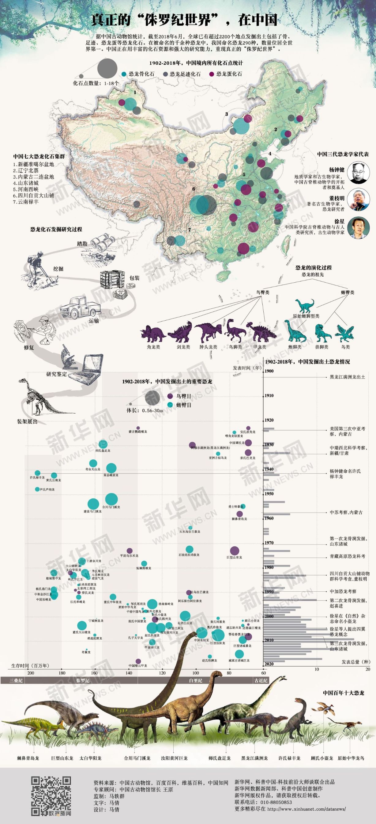 据中国古动物馆统计,截至2018年6月,全球已有超过2200个地点发掘出土包括了骨、足迹、恐龙蛋等恐龙化石。在被命名的千余种恐龙中,我国命名恐龙290种,数量位居全世界第一。中国正在用丰富的化石资源和强大的研究能力,重现真正的“侏罗纪世界”。