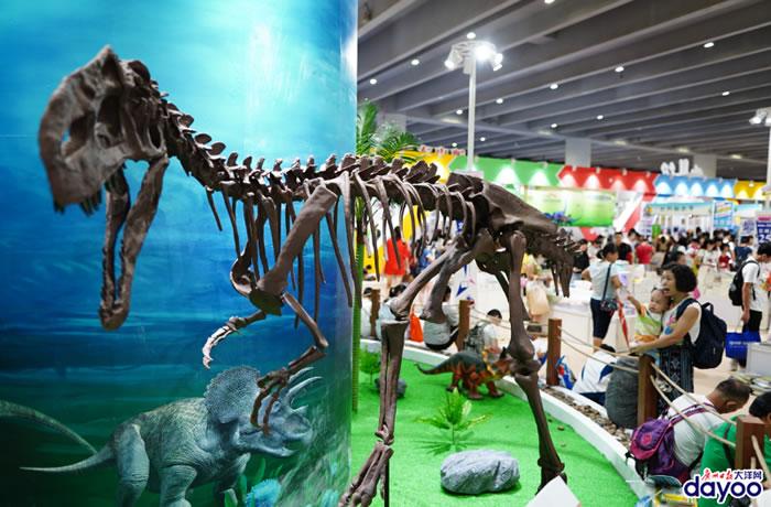 (化石网报道)据大洋网(文/广报记者黄丹彤 图/广报记者王维宣):3024平方米的2018“南国书香节”少儿馆展区,其正门入口的招牌风景是两只巨大恐龙化石展品,其中最大一只是长达6.6米,高达4米的“中华盗龙”。放眼展厅,五只造型奇特的小龙图案,分别被挂在四只硕大圆形水泥柱和侧面墙上。这些珍贵的远古动物和图案,吸引着慕名而来的数万小观众驻足拍照留念。少儿馆11日可谓出尽风头 成为南国书香节开展第二天最具人气展馆。