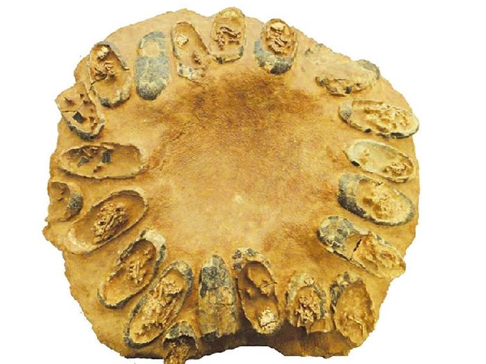 位于展厅入口处的恐龙胚胎化石是此次展览的又一亮点。据介绍,这一恐龙蛋化石是2011年通过外交途径从美国追索回来的,其原产地在江西赣州,属窃蛋龙类,时代为白垩纪。这一窝恐龙蛋为长形蛋,共计22枚,呈放射状排布,其中19枚蛋中含有恐龙胚胎的骨骼。从化石中可以看到,19个小窃蛋恐龙即将破壳而出,但是由于自然灾害而被集体掩埋,最终无缘来到这个世界。