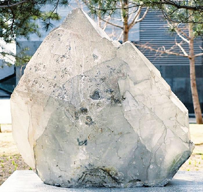 开展当天,单体“水晶王”作为中国地质博物馆的镇馆之宝亮相。“水晶王”外观看起来像一座晶莹剔透的金字塔,体型硕大,高达1.7米、最大宽度1.7米,重3.5吨,产自我国江苏省东海县。一同亮相的还有北京人头盖骨化石模型和中华龙鸟模型。