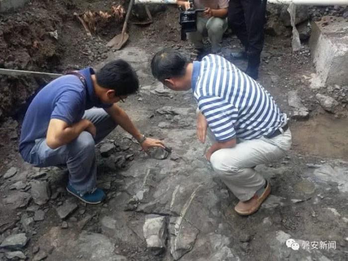 原来,8月23日晚,宅口村村民陈贵弟在家门口美丽庭院建设挖土时,挖出部分岩石内嵌有疑似化石。大家闻讯赶来围观,很多人第一反应是“恐龙”,磐安县文物办勘察后认为,可能是动物化石,疑似恐龙。