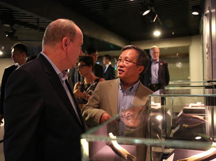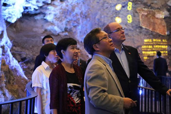 在高星研究员和周口店博物馆馆长董翠平女士的陪同下,阿尔贝二世亲王饶有兴致地参观了周口店遗址监测中心、猿人洞、山顶洞和遗址博物馆。在猿人洞-周口店第1地点新落成的保护大棚内,高星研究员向他介绍了周口店遗址和北京猿人化石及文化遗存发现的过程与独特的价值,介绍了中国政府和科研机构为发掘、保护和研究珍贵的远古人类遗产所做的努力和取得的成果。阿尔贝二世亲王询问了诸多细节,对北京猿人化石的丢失深感遗憾并询问可能的去向,对几代科学家持之以恒的发掘与研究以及中国政府为保护和管理这处重要的世界文化遗产地所做的巨大努力表达敬意。在山顶洞遗址,阿尔贝二世亲王对如此狭小的空间出土丰富而珍贵的早期现代人化石、墓葬、装饰品、石器和动物化石感到惊讶和赞叹,并询问由郭沫若先生题写的“山顶洞”三个字的含义。在遗址博物馆内,阿尔贝二世亲王在高星等的陪同和讲解下拾级而下,对展示的标本、模型、图片和模拟复原的古人类生活场景仔细观看,不时驻足询问、评论,对博物馆的布局、风格和陈列内容表示赞赏,指出这是他参观过的最好的博物馆之一,并希望出土自周口店遗址的珍贵标本能到他的国家举办展览,让摩纳哥人民也能像他一样一饱眼福。