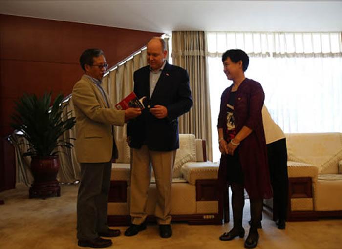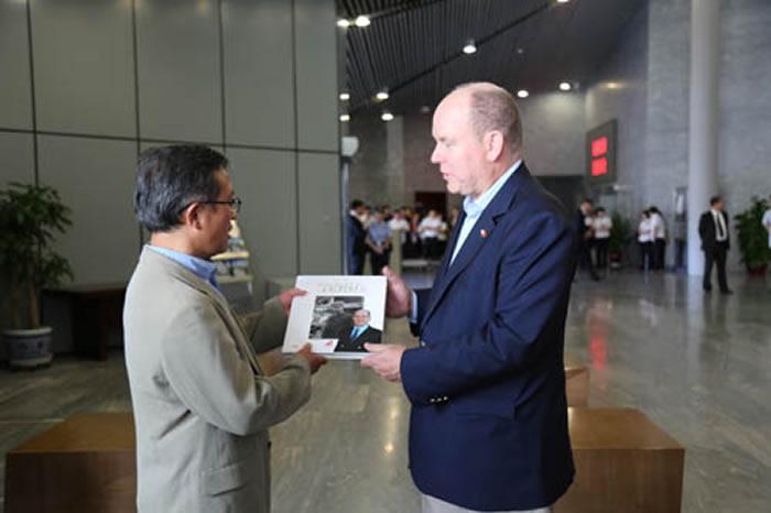高星向阿尔贝二世赠送介绍周口店遗址的书籍