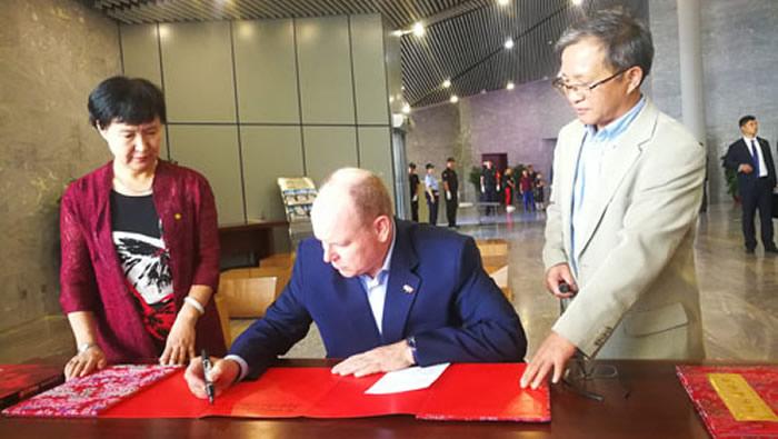 参观结束后,阿尔贝二世亲王在嘉宾留言簿上欣然挥毫题词:“非常感谢高星教授和周口店遗址博物馆负责人陪同参观周口店遗址,由衷赞赏中国科学院古脊椎动物与古人类研究所取得的研究成果。在缅怀德日进神父的同时,衷心祝愿贵所与Henry de Lumley教授负责的巴黎古人类研究所(由摩纳哥亲王阿尔贝一世创建)之间开展更多的合作研究。致以友好的致意!阿尔贝二世,2018.9.8”。