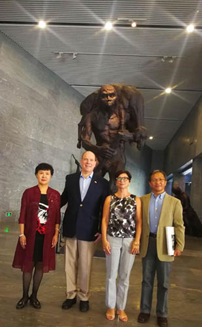 阿尔贝二世及摩纳哥驻华大使与董翠平、高星在北京猿人雕像前合影