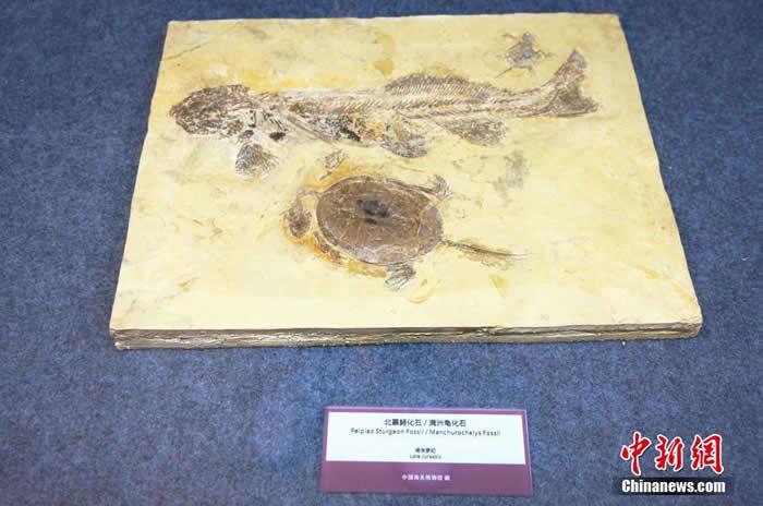 特展中展出的北票鲟化石(上)和满洲龟化石(下)。