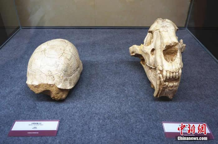 特展中展出的甘肃陆龟化石(左)和剑齿虎头骨化石(右)。