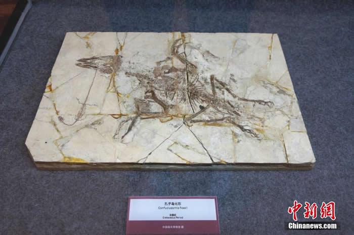 特展中展出的孔子鸟化石。孔子鸟是世界上已知最早有喙的鸟类,是一种生活在1.2亿多年前的早期鸟类。