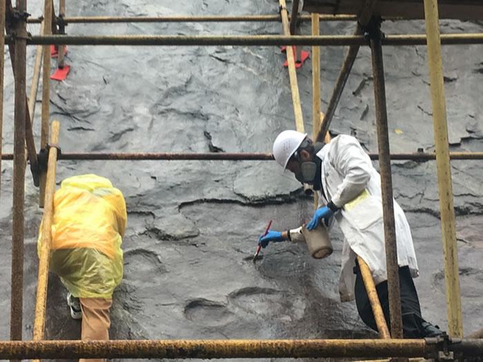 完成填充后,技术人员还将对恐龙足迹进行防水处理。曾光格介绍,技术人员将防水剂涂在足迹表面,使其能够抵挡住雨水的侵蚀。