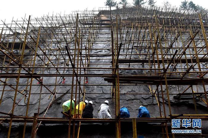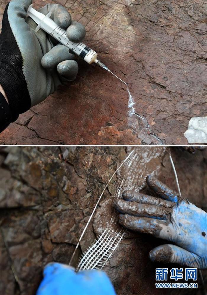 上图:保育团队工作人员用注射器将化学试剂注入岩石裂缝中,使其具备抗风化和防水能力;下图:保育团队工作人员为裂缝较大的岩层敷水泥,以防止存有恐龙足迹化石的岩层剥落。(拼版照片,10月15日摄)。 新华社记者 罗晓光 摄