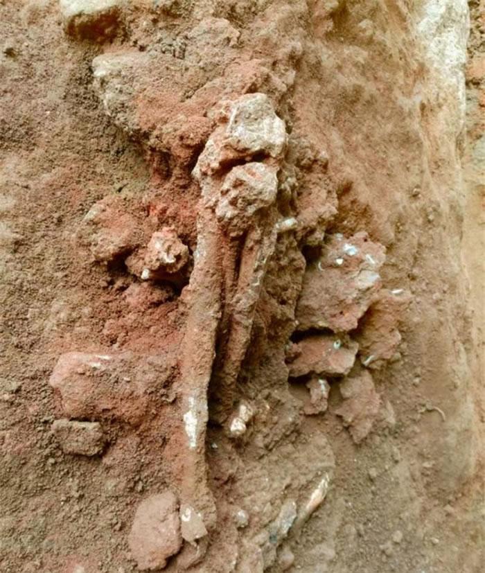 从现场情况来看,M1出土的人骨化石较为完整,包括上肢骨、椎骨、肋骨、盆骨和下肢骨等。但奇怪的是,墓穴中并未发现原始人的头骨。考古工作人员解释,该处地层堆积在地下河水流作用下局部发生过坍塌,这很可能是头骨没有保存下来的原因。