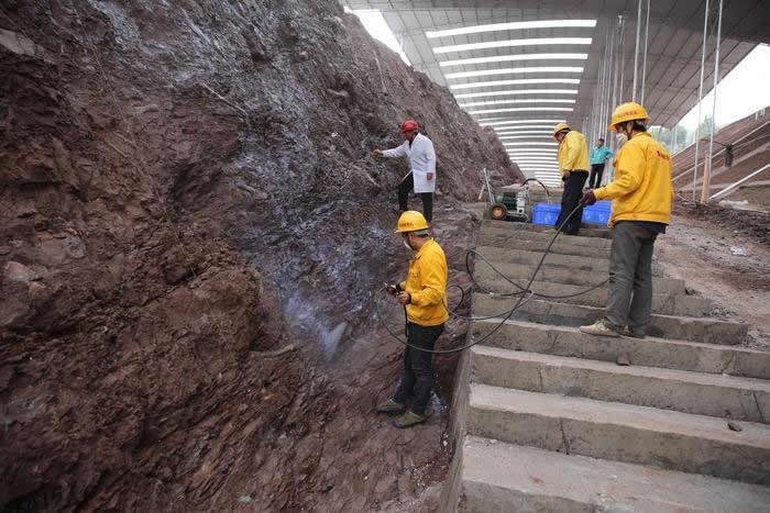 工作人员在化石墙表面喷涂保护试剂