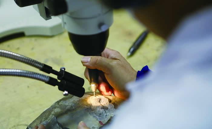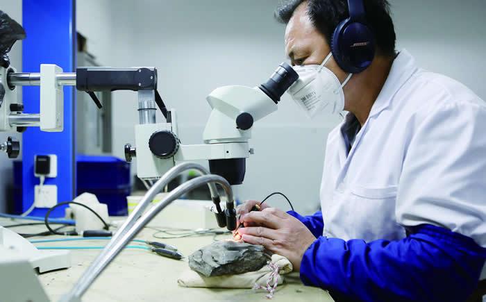 黄发忠说,这是一门综合技术,修复师要会用各种工具,例如手动的部分操作起来甚至超过雕刻行业的精细度。因为雕刻是在一块相对均匀的材质上操作,而化石修复面对的则是复杂的结构和成分。有时候,判断不准就下手,会顷刻间损毁化石。所以,“细心和专心”是他三句话不离口的原则。实际上,每块化石的修复都有自己的节奏和时间,“这是无法类比的”,黄发忠说,每块化石有自己的特点和价值,修复师所要做的,就是用精细的技术让化石恢复本来面目,为科研提供良好的标本。